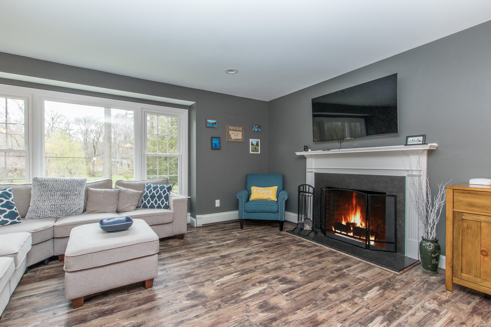 What a beautiful newly renovated living room complete with granite counter bar open to the kitchen!